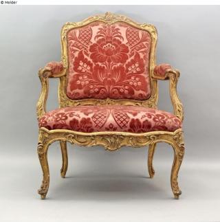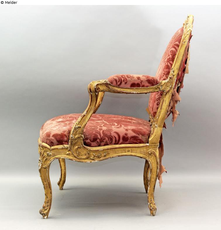 Inventarbuch-Eintrag 5.9.1952: Rokokosessel mit rosa in sich gemustertem Samtbezug rotem Damast mit eingewirktem Samtkissen, teils sehr stark beschädigt. Rahmen vergoldet u. reich geschnitzt. Die 3 Arm[?]stühle sind noch Rokoko (a. der Mitte 18. Jh), Arm[?]stühle sind breit, Armstützen mit Polsterauflagen c-förmig angesetzte Beine, die im Gegenschwung als kl. [nicht lesbar] enden. Reiches Rocailleornament an Zarge und Rückenlehne (Akanthus u. Voluten).