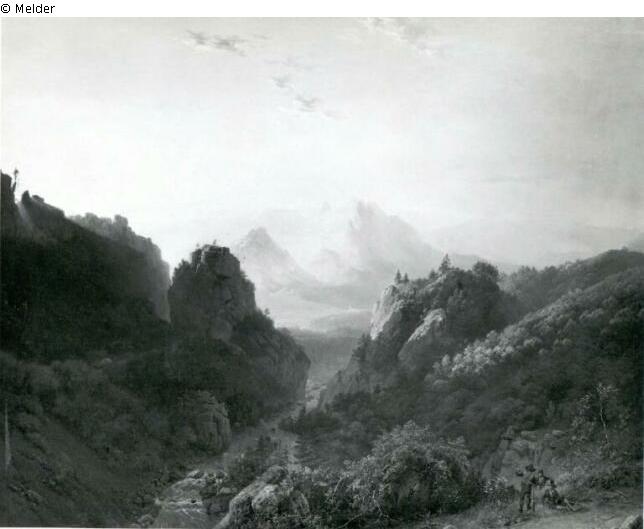 Hochgebirgslandschaft mit Waldvegetation, Gebirgsfluß und rastenden drei Jägern im Vordergrund.