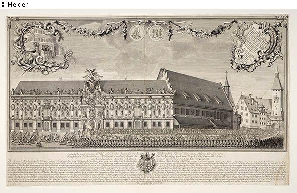 Der Zug bewegt sich auf das Teutsche Haus zu. Von rechts nähern sich verschiedene Kutschen und Militär zu Fuß und zu Pferd. Oben in der Mitte hängt an einer Girlande das eigens für die Huldigung geprägte Medaillon mit dem Bildnis des Kaisers. In der linken Kartusche ist ein Teil des Rathauses mit dem Huldigungsakt dargestellt, rechts eine Kartusche mit der Widmung des Verlegers (Jacob Seitz, Nürnberg).