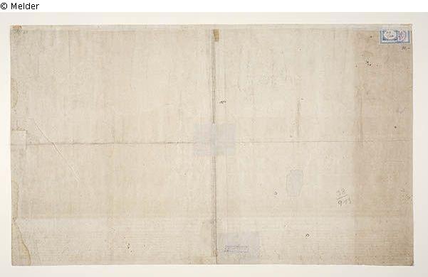 Rückseite: [Gestempelt M. re. in Blau:] Stempel der Sammlung Dr. Franz Schnitzer, München (bei Lugt: L.1046) [Gestempelt auf blau umrandeter Klebemarke o. re. in Blau:] Stempel der Sammlung Guido Friedrich Volckamer von Kirchensittenbach [daneben:] Klebemarke mit ovalem weißem Feld, mit handschrift. in brauner Tinte: 758 [darunter:] S7 18 (durchgestrichen) [unter der Klebemarke in Bleist.:] 10.- [in Bleist. o. li.:] 37) 00