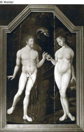 Adam links nach halbrechts gewandt, steht auf linkem Bein, das rechte seitlich leicht erhoben. Rechts Eva, die ihm Apfel reicht. In anderen Hand ebenfalls Apfel. Zwichen beiden Baum mit der Schlange, die auf Eva sieht.