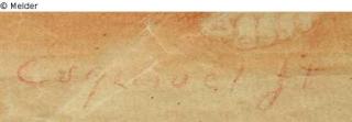 Rote Kreidezeichnung, signiert unten rechts: "Esquivel ft".