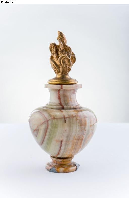 Vase mit birnenförmiger Form aus grünlich-rotem Alabaster mit Messing vergoldet, Verschluss als Flammenbündel aus vergoldetem Messingguss; Hals hat Zwirnrollenform.
