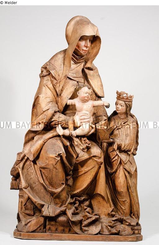 url: https://www.bayerisches-nationalmuseum.de/sammlung/00200601; Befund: Auf der Rückseite über der Höhlung handschriftlich mit Blaustift: "868". Unten in der Höhlung auf einem aufgesetzten Holzstück handschriftlich mit Blaustift: "898" oder "868" (Schreibweise wohl eher 898. Es handelt sich um eine andere Handschrift als bei der zuvor beobachteten Zahl). Unten auf dem Standbrett rechts der Mitte Inventaraufkleber der Bayrischen Staatsgemäldesammlungen, München mit der Inventarnummer "B 417 Niederbayrisch (Leinberger-Nachfolger), um 1530: Anna Selbdritt". Rechts unten auf dem Sockelbrett weißer Aufkleber, darauf handgeschrieben mit Tinte: "H 132". Auf der Vorderseite des Sockels ins Holz eingeritzt: "194". An der rechten Schmalseite der Maria handschriftlich mit weißer Farbe: "94/13"