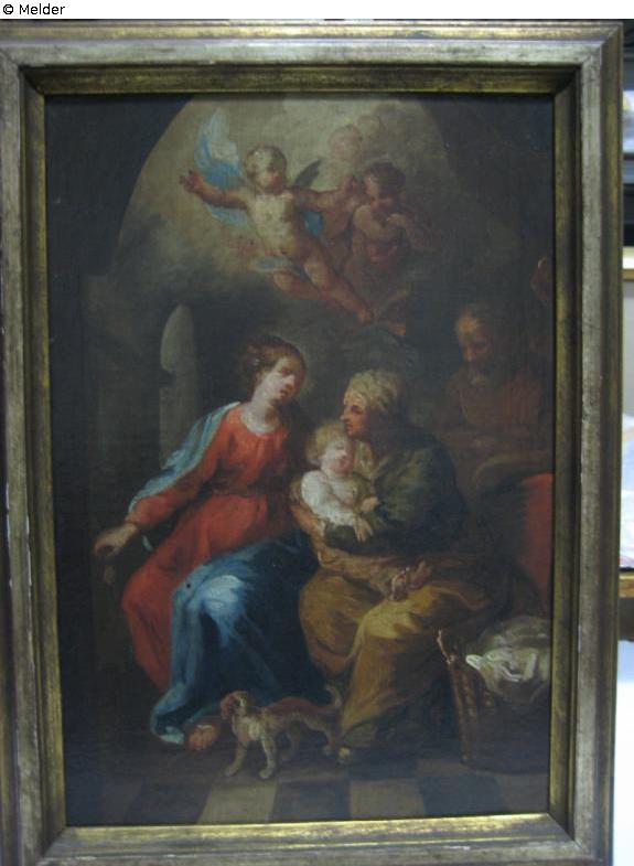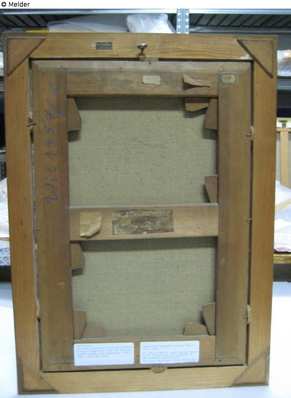 verso, auf Zierrahmen, mehrfach in Bleistift: "24931"; oben mittig, schwarzes Etikett: “SEIT 1854 F.G. CONZEN RAHMENFABRIK DÜSSELDORF“; auf Keilrahmen oben rechts in blauer Fettkreide: "Wie 1957/5; mittig oben Etikett: "1957/5"; oben rechts auf Etikett: "Regal 232"; unter dem Etikett: "356 [?]"; Etikett mit polygonalen blauem Rand: "1128"; in Bleistift: "Con[?] 24931"; auf senkrechter Keilrahmenleiste, Etikett beschrieben in Rot: "5"; Etikett beschrieben in Tinte: "J. H. Fragonard 1767 Collection Valferdint [?] […] Champs [?]"; mittig unten, zwei Etiketten: “Valferdint’ Die Vente Valferdint (richtig: Walferdin Francois-Hippolyte), also der Sammlung dieses Französischen Physikers (1795–1880), fand 1880 statt.”; “Jean-Honoré Fragonard (Grasse 1732–Paris 1806) ? Hl. Anna selbdritt (Anna, Maria, Jesuskind). Entwurf für ein Altarbild. Öl auf Leinwand (rentoiliert) Auf neuem Spannrahmen alter Zettel mit ‘J.H.Fragonard 1761 … Champs Collection”