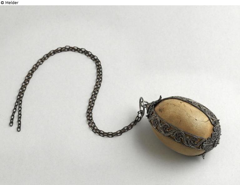 Bezoarstein, gefaßt von Silberfiligranbändern, (Rankenmuster) am oberen Ende zwei Ringe zum Aufhängen.