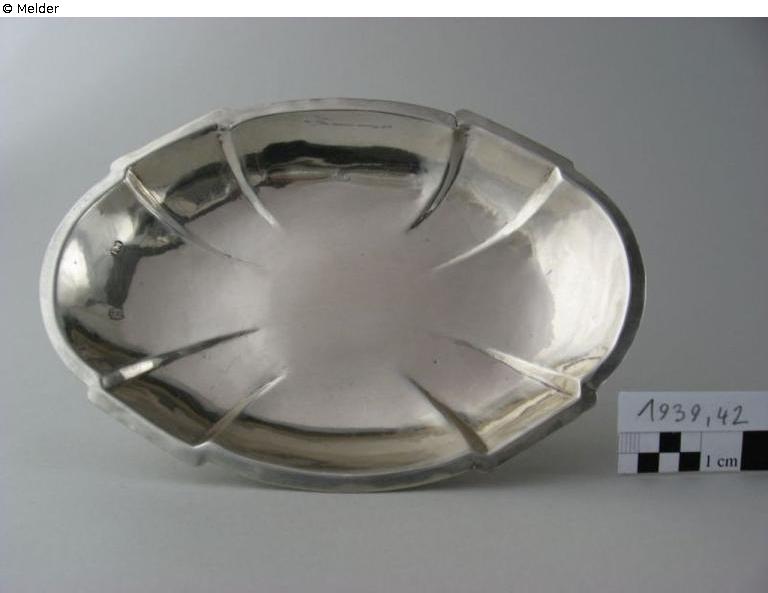 Die kleine, silberne Trinkschale ist oval und mit acht Falten dekorativ gestaltet. Durch die Faltung springt der flache Rand leicht vor- und zurück. Die Schale ruht auf einem glattwandigen, kurzen Mittelstück, das sich konisch nach unten erweitert und auf einen gewölbten Fuß mit flachem Standring gesetzt wurde.