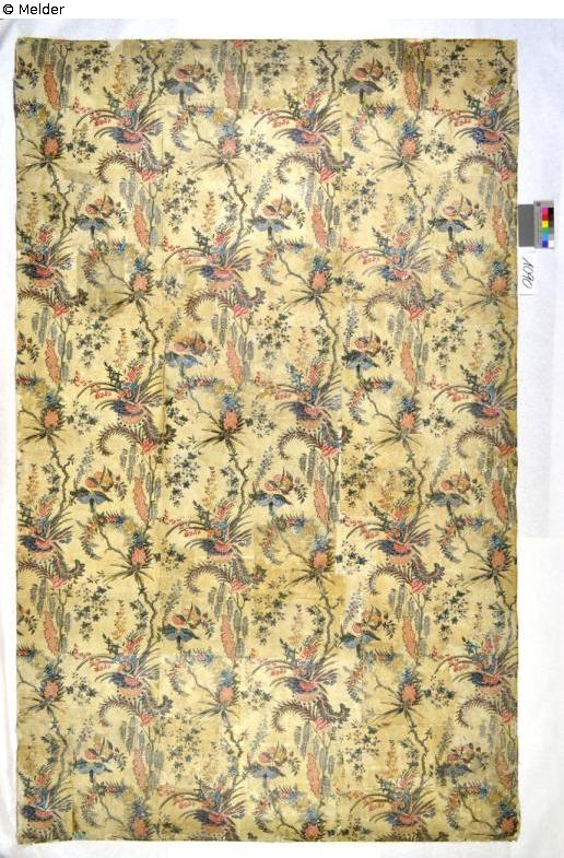 Handdruck auf Bogenpapier. Die Umrisse sind schwarz und hellbraun gedruckt, während die weiteren vier Farben mit Hilfe von einfachen Schablonen aufgetragen worden sind. Die ersten handgedruckten Tapeten wiederholen im Muster noch den Charakter der früheren Dominopapiere mit den schwarzen Umrissen der Figuren. Die anderen Farben wurden jedoch nicht wie bei den Vorgängern mit Hilfe von Schablonen aufgetragen, sondern ebenfalls mit Holzmodeln aufgebracht. Bogen in gelblichem Fond mit aufsteigendem Blumenbouquet.