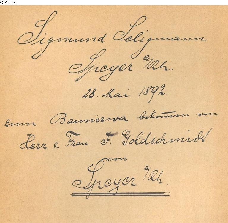 NS-Raubgut 1.) Geschenk der Stadt Speyer an die Saarpfälzische Landesbibliothek 1941 im Zuge der Deportation der saarpfälzischen Juden am 22.10.1940 nach Gurs (Frankreich) 2.) Autogramm und Notiz zum Geschenk "Sigmund Seligmann Speyer a. Rh. 28. Mai 1892. zum Barmizwa bekommen von Herr & Frau F. Goldschmidt von Speyer a. Rh.": Seligmann, Sigmund, geb. am 22.5.1879 in Speyer, Kaufmann; 1940 nach Gurs deportiert; verst. am 15.12.1940 ebd.