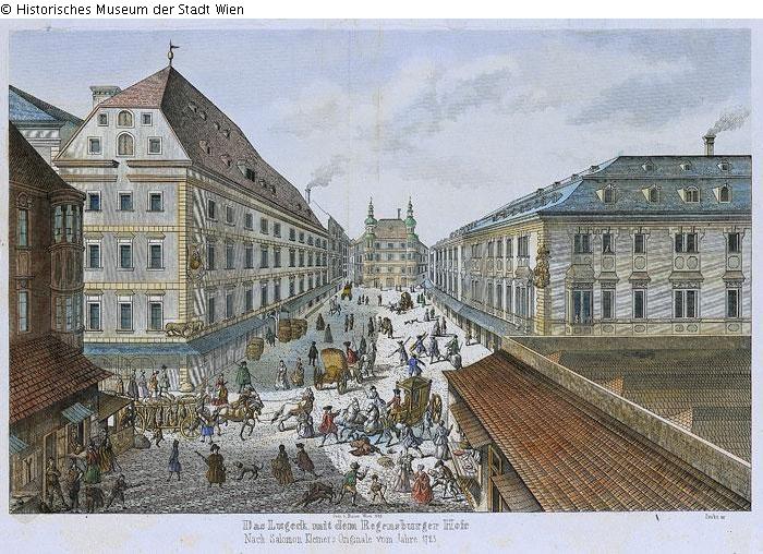 Stadtansicht Wien; Titel unten: Das Lugeck mit dem Regensburger Hofe / Nach Salomon Kleiner's Originale vom Jahre 1725; Bezeichnung Mitte unten: Gedruckt bei Bauer Wien 1855., rechts unten: Zinke sc