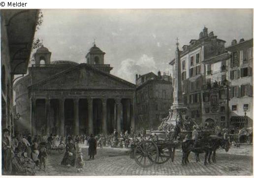 In der linken Bildhälfte hinten das Pantheon, rechts vier Häuser des Platzes. Davor, ebenfalls noch in der rechten Bildseite, der Brunnen mit obeliskartiger Säule. Davor eine stehende, zweirädrige, mit drei Pferden bespannte Karre, mit Rädern fast in der Größe der Pferde.