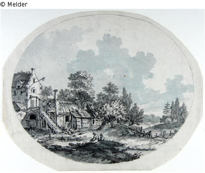 Das Wirtshaus am Weiher, vorn zwei Knaben