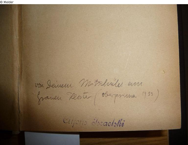 Stempel: Alfons Israelsi ; Widmung: "von Deinem Mitschüler am Grauen Kloster (Oberprima 1933)"