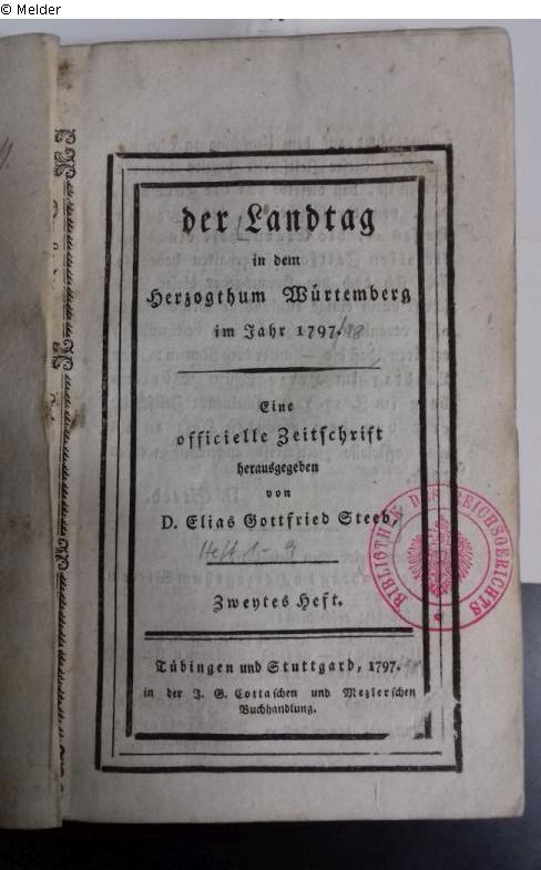 Buch; Papier, Druckerschwärze, Bindung, Textil, Einband. H 16,5 ; B 10 cm. Leicht gebräunt, stockfleckig. Diverse Zahlen und Notizen: "KW 1483", "JXIV 136", "Landtag" "37018"; mit einem farblosen, weißen Aufkleber verdeckter Stempel: "Bibliothek des Reichsgerichts" (rot).