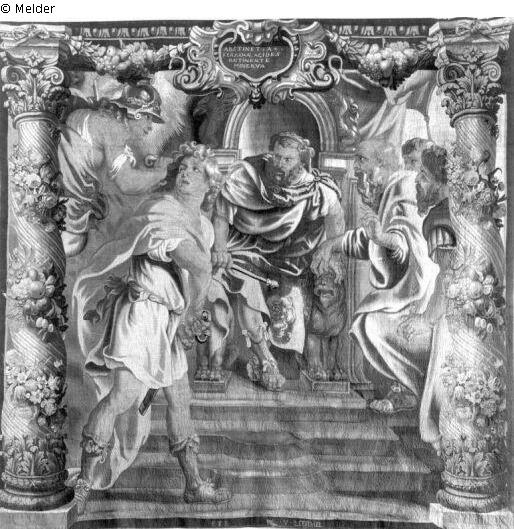 Gewebte Tapisserie (Bildteppich); Signatur v. Leefdael; Brüssel um 1660, Von links oben erscheint die Göttin, Ajax scharf nach links gedreht. Der König auf dem Thron in der Mitte. Rechts weitere Figuren. Oben Kartusche mit Inschrift, an den Seiten gedrehte Säulen mit Blumen.