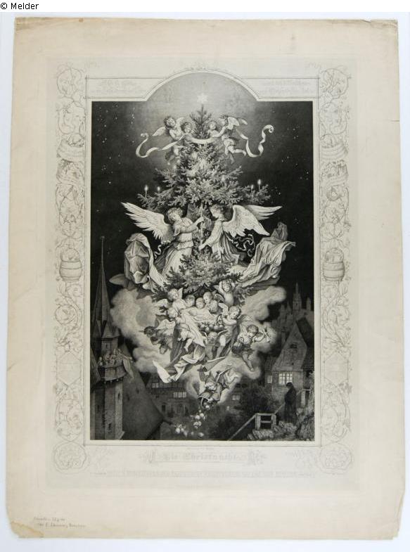 Eine Engelschar trägt das Jesuskind auf Wolken in den Nachthimmel, über dem Kind zwei Cherubim einen Tannenbaum haltend. In der unteren Bildhälfte eine Stadt erkennbar.