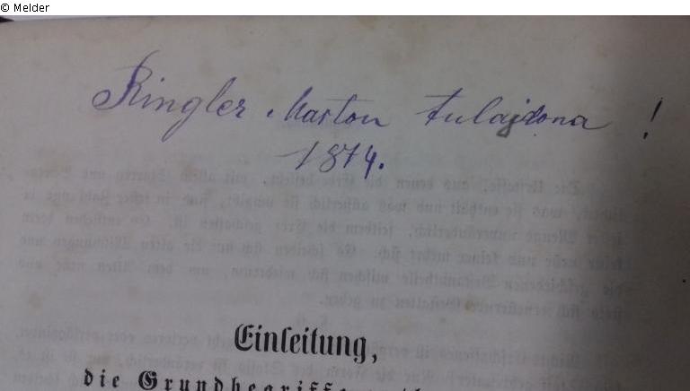 Buch; Papier, Druckerschwärze, Bindung, Leineneinband, Goldprägung. H 23 cm ; B 16 cm. Handschriftlich: "Ringler Fery III Rer Budapest...7.n.a.1890"; "Ringler, Martin Tulaidona! 1874".