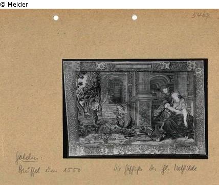 Links Frauengestalt im Walde. Rechts daneben sitzende Frau, trauernd, dahinter Gefängnis. Rechts antikes Gemach mit sitzender Frau die von einem Mann in antikem Gewand umarmt wird. Zu ihren Füßen Waffen.