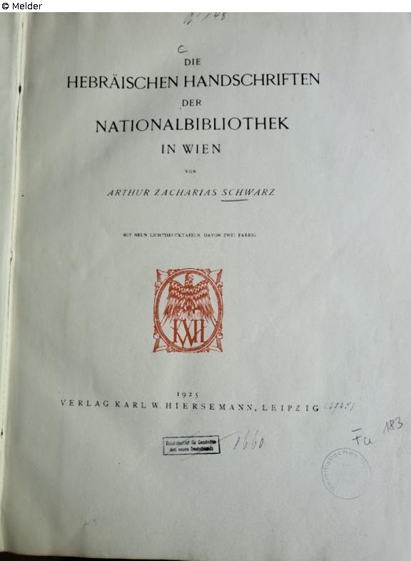 Fundmeldung | Einzelobjekt Die hebräischen Handschriften der Nationalbibliothek in Wien Lost Art-ID632690 Vorherige Weiter Autor:in Schwarz, A. Verlag Hiersemann TitelDie hebräischen Handschriften der Nationalbibliothek in WienErscheinungsortLeipzig Erscheinungsdatum1925ObjektartBuchObjektgruppeBibliotheksgutSignatur1207/Fa 183Beschreibung Stempel "Reichsinstitut für Geschichte des neuen Deutschlands" (A148/8660 ). Weiterlesen Weniger anzeigen Veröffentlicht seit28.10.2025 Kontakt Ludwig-Maximilians-Universität Institut für den Nahen und Mittleren Osten Bibliothek Veterinärstr. 1 80539 München Deutschland Tel0049-89-2180-3039Homepagehttps://www.naher-osten.uni-muenchen.de/institut/bibliothek/index.html Ansprechpartner:in Prof. Dr. Ronny VollandtPositionProfessor für JudaistikE-Mailronny.vollandt@lmu.de