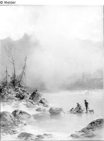 Winterlandschaft mir gefrorenem See.Am Ufer Felsblöcke. Zwei Jäger mit erlegtem Hirsch und 3 Dackel.Rechts im Nebel Burg. Hintegrund stark im Nebel Bergspitzen.