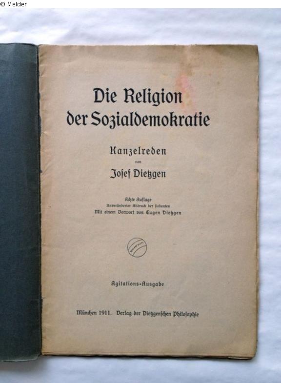 Fundmeldung | Einzelobjekt Die Religion der Sozialdemokratie. Kanzelreden. (8. Auflage) Mit einem Vorwort von Eugen Dietzgen. (Agitations-Ausgabe) Lost Art-ID520865 Vorherige Weiter Autor:in Dietzgen, Josef Drucker:in F.-Bruckmann-AG Verlag Verlag der Dietzgenschen Philosophie TitelDie Religion der Sozialdemokratie. Kanzelreden. (8. Auflage) Mit einem Vorwort von Eugen Dietzgen. (Agitations-Ausgabe)ErscheinungsortMünchen Erscheinungsdatum1911ObjektartBuchObjektgruppeBibliotheksgutSignaturo.Nr.Provenienz unbekannt Weiterlesen Weniger anzeigen Veröffentlicht seit11.08.2014 Kontakt Provenienzforschung, Hausarchiv, Bibliothek Potsdam-Museum - Forum für Kunst und Geschichte Am Alten Markt 9 14467 Potsdam Deutschland Tel+49(0)331 - 289 6821Fax+49(0)331 - 289 6808E-Mailmuseum-geschichte@rathaus.potsdam.deHomepagehttp://www.potsdam.de/potsdam-museum