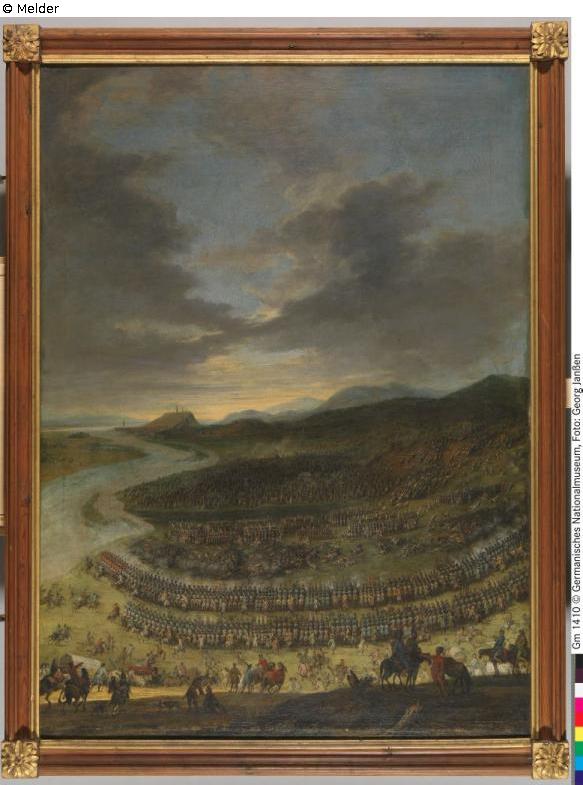 Hinter einem dunklen, braun-grünem Vordergrundstreifen, auf dem links am Bildrand eine Dame zu Pferde, begleitet von einem gestikulierenden Kavalier, weiter zur Mitte zwei Gruppen von Schlachtenbummlern mit Hunden und rechts eine Gruppe fremdartig gekleidete Reiter (wahrscheinlich Ungarn) erscheinen, fällt das Gelände jäh ab und öffnet sich zu einer weiten Flußniederung, in der sich die Schlacht abspielt. Vordergrund und Mittelgrund werden durch sich in die Tiefe bewegende Gruppen, wie einem Marketenenderzug, eine Reitergruppe und durch - in der Farbe wie in den besonders delikat gemalte Einzelfiguren verbunden. Mit dem Rücken zum Beschauer gewendet, sind die Habsburgischen Streitkräfte, in zwei "Wellen" gestaffelt in einem großen, die ganze Breite des Bildes einnehmenden Halbkreis aufgestellt, links begrenzt von der Save, die sich in einer großen Kurve in die Bildtiefe schlängelt und sich dann in die Donau ergießt, rechts vom Bildrand. Der linke Flügel wird bei der vorderen und hinteren Linie durch starke Kavallerie gebildet, nach der Mitte zu wechseln kleine Kavallerie- und Infanterie-Einheiten. Unter Einwirkung der kaiserlichen Artillerie, die hinter den Kämpfenden erscheint die türkische Streitmauer ähnlich der Kaiserlichen, jedoch dreifach gestaffelt aufgestellt, ihr linker Flügel ist bereits in der Auflösung begriffen und in hellen Scharen flüchten berittene Gruppen in die über der Niederung sich erhebenden Berge. Das Zeltlager der Türken, über das ein Dunkel gebreitet ist, wird im Rücken der türkischen Front sichtbar und im Hintergrund schließlich, am Ende der von rechts her nach den Flüßen zu sich bewegende Höhenzug erscheint Stadt und Festung von Belgrad. Vor dem Schlachtfeld wölbt sich ein grauer, an einzelnen Stellen durch lichtes Blau aufgehellter Himmel. Hinter Belgrad erscheint das erste fahle Gelb der aufgehenden Sonne. Die Farbigkeit des Bildes ist durch das bräunliche Grün der Landschaft bestimmt, das nach dem Vordergrund zu ins gelbliche aufgehellt ist. Die türkischen Truppen sind farblich dem Ganzen angepasst, die habsburgische Streitmacht ist in vielfach abgewandelten grünlich-grauen und blau-grauen Tönen gegeben. Im Vordergrund gibt ein sattes Rot kräftige Akzente.