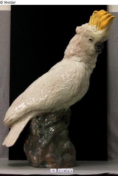 Majolika, roter Scherben, polychrome Scharffeuerbemalung, weißer Kakadu.