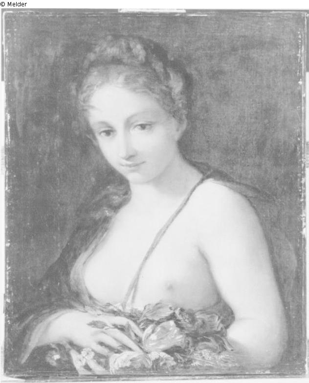 Eine blondhaarige junge Frau hält in den Händen einen Blumenstrauß. Sie trägt ein locker über die rechte Schulter gelegtes Kleid; linke Schulter und Brust sind entblößt. Dunkelbrauner Hintergrund.