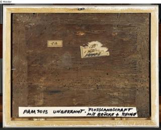 Auf der Rückseite des Bildträgers Klebe-Etikett, beschriftet handschriftlich in Schwarz mit zwei Zeichen/ Buchstaben (?); Rechts davon Klebe-Etikett, beschriftet handschriftlich mit: „No. 185 (…) / 1 Bild (nachträglich mit Bleistift von anderer Hand: „+ Rah(…)“ / 12403 (nachträglich mit Bleistift durchgestrichen)“.