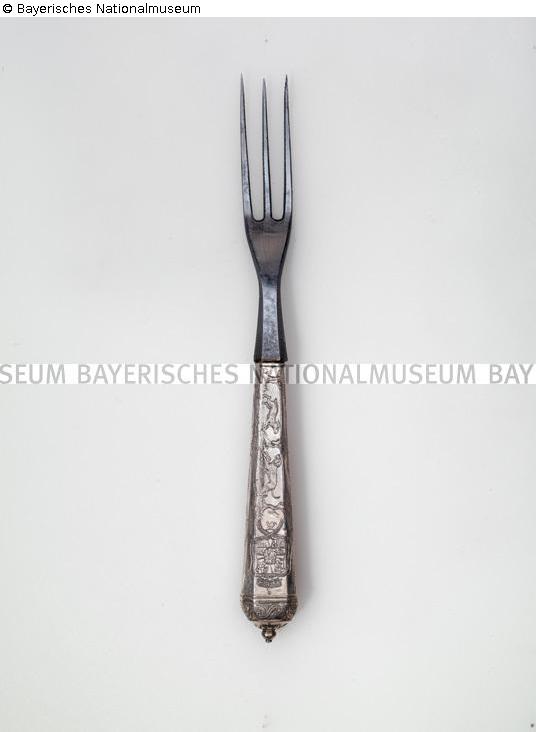 Befund: Auf der Oberseite der Gabel das Große Staatswappen des dänischen Königshauses. Auf der Rückseite der Gabel (auf dem Abschlussprofil) niederländische Repunze "kleiner Eberkopf" nach rechts. Auf der Unterseite der Gabel (am Stil der Schaufel) handschriftlich mit schwarzer Farbe "76/32 (9)" (Inventarnummer des Bayerischen Nationalmuseums).