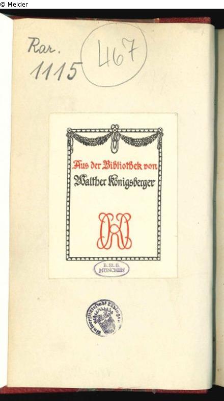 Städtische Sammlung Tübingen. Stammt aus der Bibliothek von Walther Königsberger, einem deutsch-jüdischen Zahnarzt aus Würzburg, der 1916 verstarb. Enthält eine Schenkernummer der Gestapo: GN. 14428. Weitere Vorbesitzer sind unbekannt.