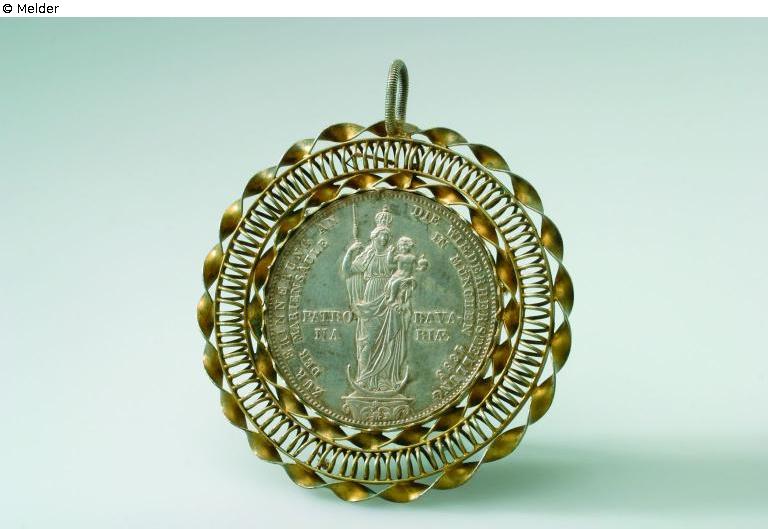 Vergoldeter Doppelgulden anlässlich der Wiederherstellung der Mariensäule unter Maximilian II. Joseph, umgeben von einer Fassung aus zwei gedrehten und vergoldeten Silberbändern, dazwischen Spirale aus Silberdraht. Vergoldung der Münze fast völlig abgerieben. An der Oberseite ovale, gerillte Öse.