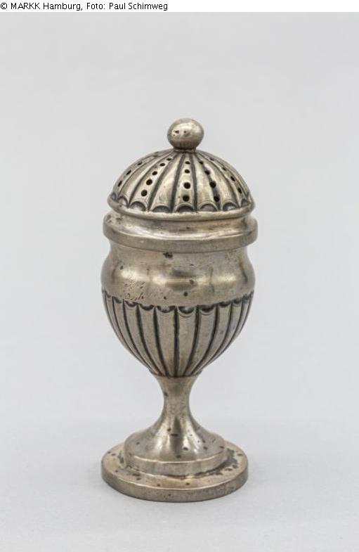 Runder Fuß, Eierbecherform, unterhalb des Randes Einschnürung. Bauchbereich gewelltes Muster, flach gewölbte Haube mit kugeligem Deckelknopf und durchbrochener Riefelmusterung.