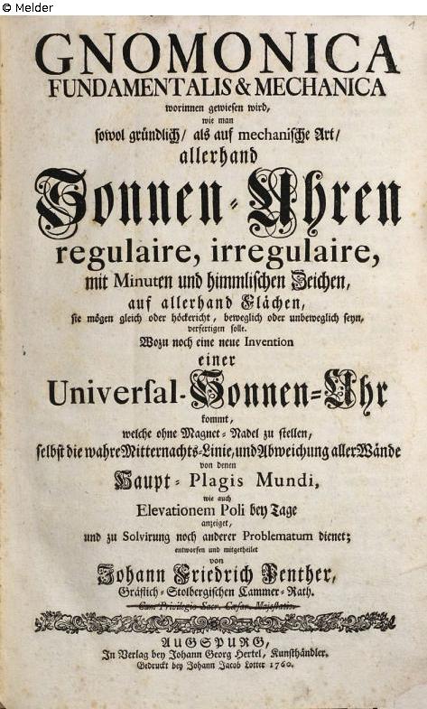 worinnen gewiesen wird, wie man ... Sonnen-Uhren regulaire, irregulaire ... verfertigen solle ; Wozu noch eine neue Invention einer Universal-Sonnen-Uhr kommt, welche ohne Magnet-Nadel zu stellen ...