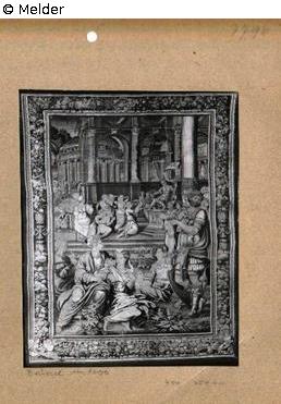 Gobelin - Im Vordergrund sitzende Frauen und sitzender Krieger. Im Hintergrund in einer Halle sitzender Kaiser auf einem Sockel mit knienden Frauen. Umrandung Fruchtgehänge, unten rechts und links je zwei Putti.