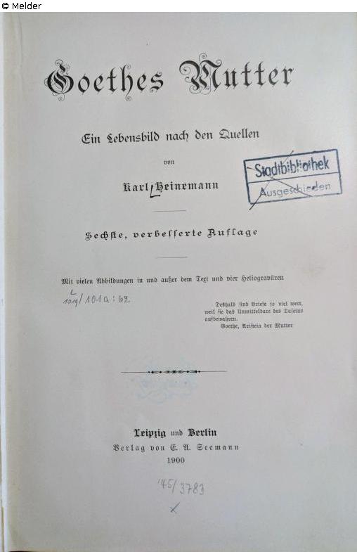 Hardcover, Einband aus Pappe, 358 S. in Fraktur, Exlibris Leipziger Stadtbibliothek, ausgerissener Leihzettel, Altsignatur Biogr. 3917, Zugangsnummer Leipziger Stadtbibliothek 45/3783, Stempel "Stadtbibliothek Augeschieden" (gestrichen), Stempel Leipziger Stadtbibliothek, Preisangabe 8,- R