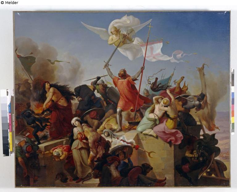 Fundmeldung | Einzelobjekt "Gottfied von Boullion vertreibt die Heiden aus Jerusalem" Lost Art-ID629605 Vorherige Weiter Hersteller/Künstler:in Mücke, Heinrich Karl Anton Geburt 1806.04.09, Breslau Tod 1891.01.16, Düsseldorf Titel"Gottfied von Boullion vertreibt die Heiden aus Jerusalem" Datierung1846ObjektartGemäldeObjektgruppeMalereiMaterial / TechnikÖl ; Leinwand / gemalt Höhe 95,00 cm Breite 116,00 cm InventarnummerGK 1271Beschreibung Schlachtenszene mit Kreuzfahreren Weiterlesen Weniger anzeigen Provenienz 1978 von der Galerie Roy Miles, London, erworben Weiterlesen Weniger anzeigen Literatur / Quelle Ausst.-Kat. Münster 2018, Frieden. Wie im Himmel so auf Erden? Hg. Vom Bistum Münster, Dresden 2019. Weiterlesen Weniger anzeigen Veröffentlicht seit28.05.2025 Kontakt Hessisches Landesmuseum Darmstadt Friedensplatz 1 64283 Darmstadt Deutschland Tel+49 6151-3601-200Fax+49 06151-1657199E-Mailinfo@hlmd.deHomepagehttps://www.hlmd.de/de/ Ansprechpartner:in Dr. Martin FaassPositionDirektorTel+49 6151-3601-001