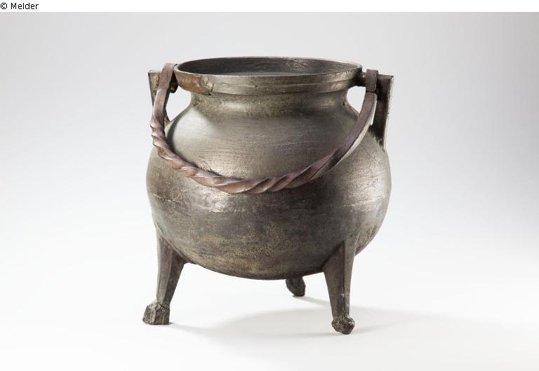 Der gedrückte kugelförmige Korpus geht in den Hals mit gestuftem, ausschwingendem Rand über. Gegenläufig sitzen zwischen Schulter und Rand zwei geknickte Ösen, durch die ein Eisenbügel geführt ist. Der Korpus ruht auf drei hohen, mehrkantigen Beinen, die in Löwentatzen münden.