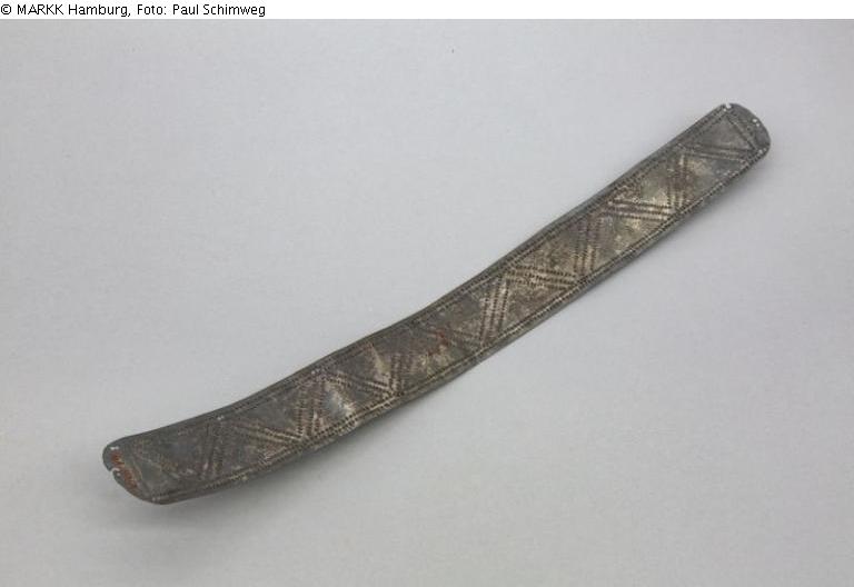Schmaler, gehämmerter Schmuckstreifen aus Silber, punziert. Seitlich Lochungen, wohl zur Befestigung.
