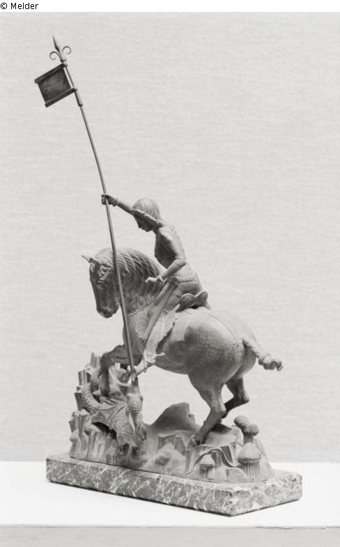 auf dem Marmorsockel vorne mittig Etikett BStGS "Inv.Nr. B 638", auf dem Sockel links handgeschriebenes Schild "Hst 262, Notke, B. (Kopie), St. Georg" [Hinterstellung BStGS], auf dem Sockel hinten mit roter Farbe handschriftlich "B 638", loses Schild um den Vorderfuß des Pferdes "B 638, Künstler: unbekannt 20 Jhd, Titel: Der Heilige Georg, ehem. Hst 262"