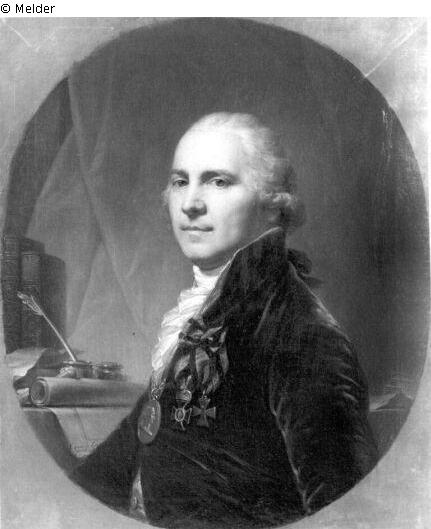 Signatur: Eques de Lampi pinxit 1801; Halbportrait nach links, der Herr aus dem Bild schauend. Links vor ihm Schreibgerät. Ovale Form.