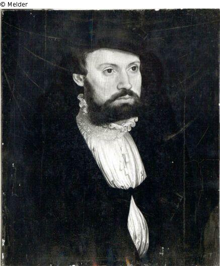 Vor dunkelgrünem Vorgang Brustbild eines braunbärtigen Mannes nach halbrechts. Im Ausschnitt des schwarzen Rockes weißes Hemd mit Spitzenkrause; schwarzes Barett.