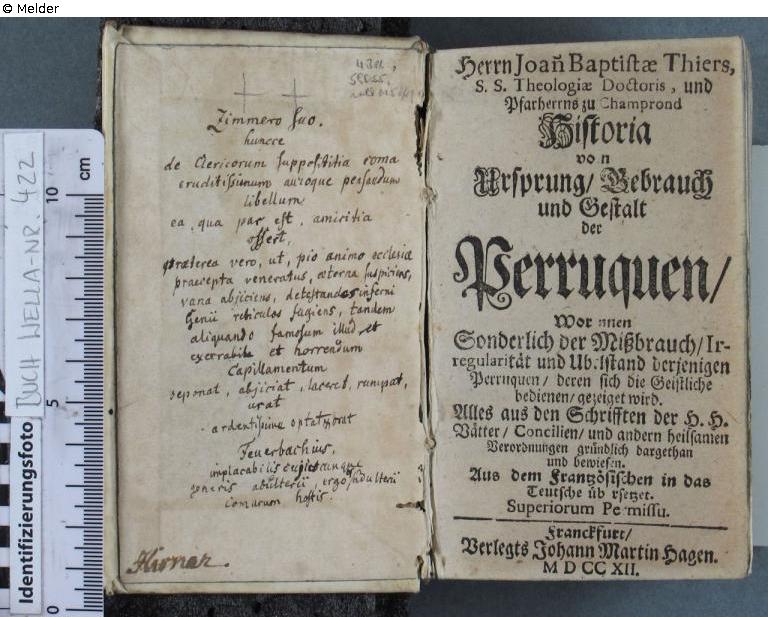 Fundmeldung | Einzelobjekt Historia von Ursprung, Gebrauch und Gestalt der Perruquen Lost Art-ID622780 Vorherige Weiter Autor:in Jean-Baptiste Thiers Verlag Johann Martin Hagen TitelHistoria von Ursprung, Gebrauch und Gestalt der PerruquenErscheinungsortFranckfurt (Frankfurt) Erscheinungsdatum1712ObjektartBibliotheksgutObjektgruppeBibliotheksgutSignaturWe-GR 422Beschreibung auf dem Spiegel mit Feder in Braun: Kirner [?] Weiterlesen Weniger anzeigen Provenienz ? - ?: Kirner [?]; [...]; 30.06.1969 - 2013: Museum Wella Darmstadt, angekauft von Antiquariat Gerhard Scheppler, München; 2013: als Schenkung an das HLMD Weiterlesen Weniger anzeigen Veröffentlicht seit22.07.2024 Kontakt Hessisches Landesmuseum Darmstadt Friedensplatz 1 64283 Darmstadt Deutschland Tel+49 6151-3601-200Fax+49 06151-1657199E-Mailinfo@hlmd.deHomepagehttps://www.hlmd.de/de/ Ansprechpartner:in Dr. Martin FaassPositionDirektorTel+49 6151-3601-001