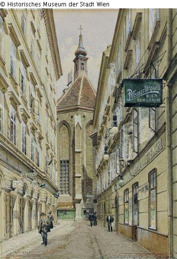 Stadtansicht Wien; Bezeichnung links unten: Wien I. / Steindelgasse., signiert und datiert rechts unten: Richard Moser / 1911.