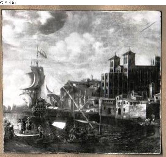 Links im Bild die Hafengebäude. Etwas zurückgesetzt eine Kathedrale mit zwei rechteckigen Türmen und erkerartigen Vorbau. Im Vordergrund der Hafen mit einem Segelschiff mit gesetzten Segeln, an der Mole Boote und Staffage.