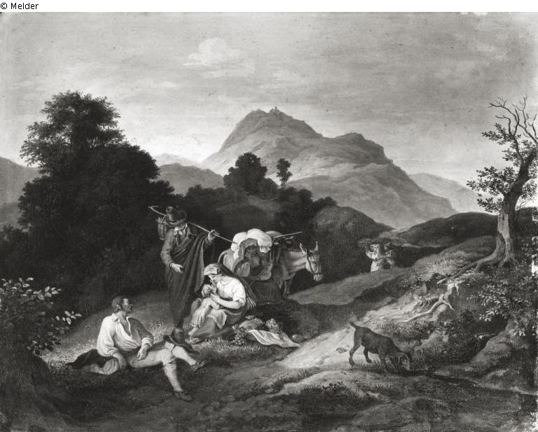 Befund Rückseite: bezeichnet rechts unten auf einem Stein: "L. Richter 1833", Leinwand mit Sperrholz doubliert, auf der Rückseite oben links mit Blau "UX R 27/2° [Standort Meiserstr.], oben mittig rechteckiges, weißes Schild mit Maschinenschrift: "Transport 2.10.46 / Julius Streicher / Schloss Egg", oben rechts in Blau "38164" [Münchner Nummer], rechts in Schwarz "PR" [Photo Roth], darunter zwei Aufkleber BStGS jeweils "Inv. 12031", darunter handschriftlich mit Blau "Mit Wachsemulsion auf Sperrholz doubliert", auf dem Rahmen oben links ein weißes Schild darauf handschriftlich "X R 4/2m" und klein gedruckt am unteren Rand "...uß, München", unten mittig in Schwarz "17223"