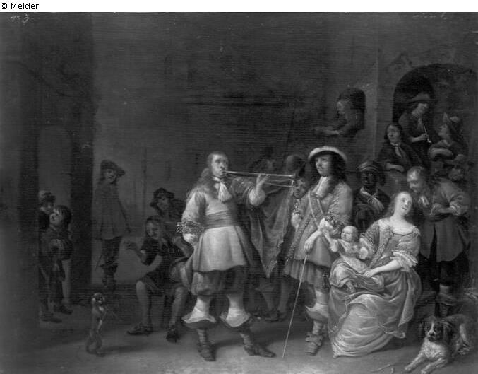 Das Gemälde zeigt eine Gesellschaftsszene mit zahlreichen Figuren. Im Zentrum des Werkes befindet sich ein stehender Mann nach rechts mit gelbem Rock und blauem Hüftband, der in eine Trompete bläst. Rechts von ihm ist ein weiterer stehender Mann nach links in gehobener Kleidung zu sehen, der seine linke Hand auf einen Gehstock stützt. Am rechten Bildrand befindet eine Frau in langem Kleid, auf deren rechten Oberschenkel ein Kind sitzt. Die Frau ist zum rechten Bildrand gebeugt und hört einem Mann zu, der hinter ihr steht. In der rechten unteren Bildecke ist ein Hund, im linken Bildteil ein Affe dargestellt. Im Bildmittelgrund befinden sich zahlreiche Figuren, die zumeist der Figurengruppe im Vordergrund zugewandt sind. Im Hintergrund ist Architektur zu erkennen, links ein Torbogen, in dem zwei Jungen stehen.
