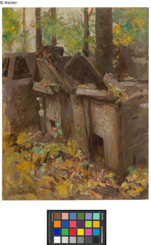 "Mehrere jüdische Grabmäler unter Herbstlaub und großen Bäumen." (Berger-Inventar); Zierrahmen; signiert links unten: "J. Epstein"