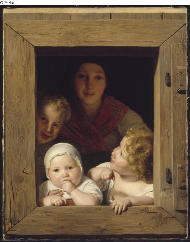 Eine junge Bauernfrau blickt mit drei Kindern aus einem Fenster heraus. Der briete, hölzerne Fensterrahmen ist in täuschender Naturtreue dargestellt. Ganz links im hellen Licht, das jüngste Kind, etwa einjährig. Es wird von der Mutter gehalten. Es blickt frontal aus dem Fenster heraus und hat eine weiße Haube auf. Rechts ein blondlockiger Junge von etwa drei Jahren. Während der den Kopf nach links oben zurücknimmt, deutet er mit dem Zeigefinger der rechten Hand auf den Betrachter. Links hinter dem Jüngsten ein etwa Fünfjähriger, ebenfalls blond. Er schaut lachend heraus. Die Kindergesichter sind meist im hellen Licht, während das der Mutter nur von zartem Reflexlicht erhellt ist.