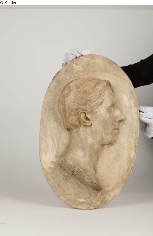 Medaillonförmiges, rund 60 Zentimeter hohes Gipsrelief mit dem Porträt eines jungen Mannes im Profil; eventuell ist Raymond Mortimer dargestellt (Vgl. National Portrait Gallery, London, Inv.-No. NPG 6072); Signatur „Hamann London 30.“